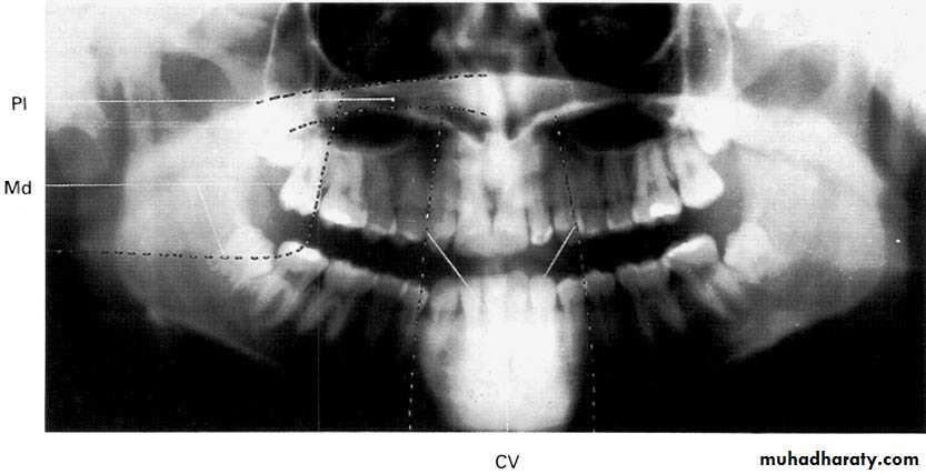 A dental panoramic tomograph showing the main anatomical ghost or artefactual shadows drawn in on one side of the radiograph, PI — palate, Md — mandible, CV — cervical vertebrae.