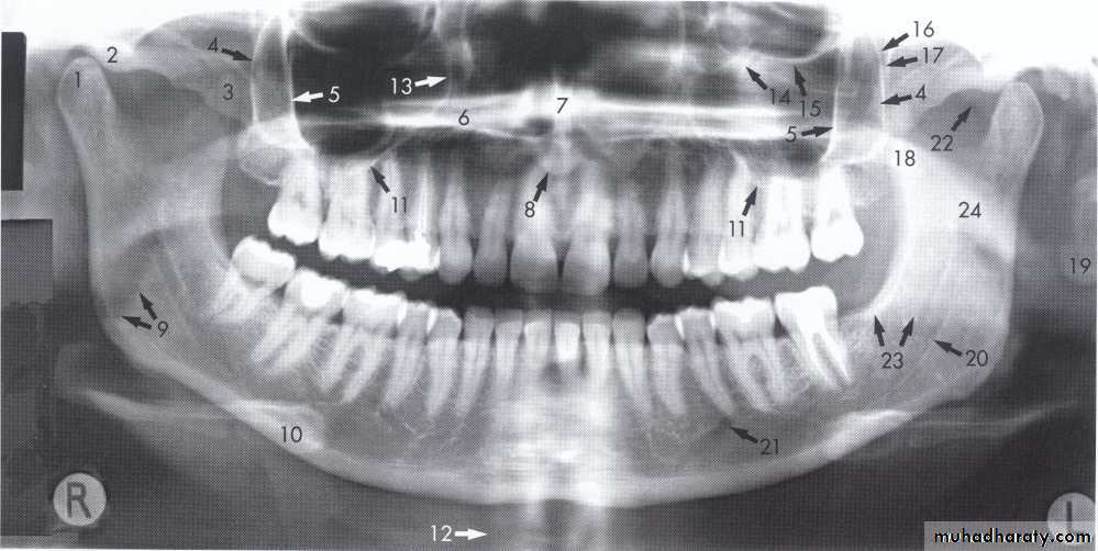 1, Mandibular condyle. 2, Articular eminence. 3, Coronoid process of mandible superimposed on zygomatic arch. 4, Posterior wall of maxillary sinus. 5, Posterior wall of zygomatic process of maxilla. 6, Hard palate. 7, Nasal septum. 8, Tip of nose. 9, Dorsum of tongue. 10, Hyoid superimposed over inferior border of mandible. 11, Inferior border of maxillary sinus. 12, Image of cervical spine. 13, Medial border of maxillary sinus. 14, Infraorbital canal. 15, Infraorbital rim. 16, Pterygomaxillary fissure. 17, Anterior border of the pterygoid plates. 18, Lateral pterygoid plate superimposed over soft palate and coronoid process of mandible. 19, Ear lobe. 20, Inferior border of mandibular canal. 21, Mental foramen. 22, Posterior wall of nasopharynx. 23, Inferior border of mandible superimposed from opposite side. 24, Soft palate over mandibular foramen of mandible.