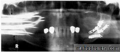 Metallic bone plates used for fixation of a fracture of the left side of the mandible
