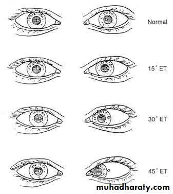 AC/A ratio, is a physiological response to excessive hypermetropia and is beyond the patient's fusional divergence amplitude.The deviation presents at about the age of 2.5 years, with a range of 6 months to 7 years. The two types are: