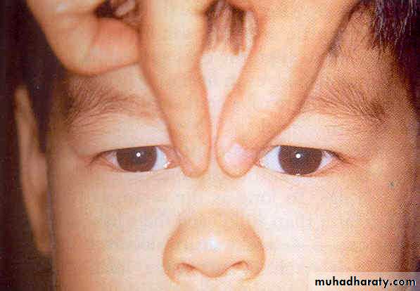 This pattern of crossed fixation will give the false impression of abduction deficit with a bilateral sixth nerve palsy. However, abduction can usually be demonstrated by either using the doll's head manoeuvre or rotating the child.