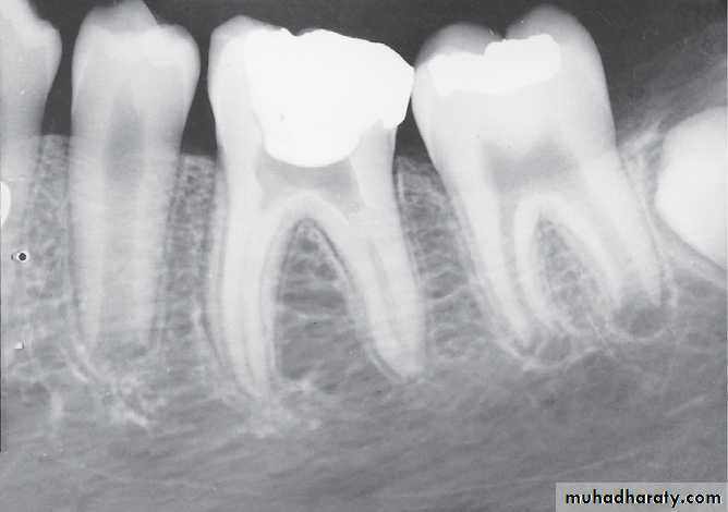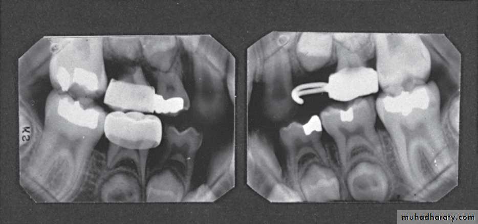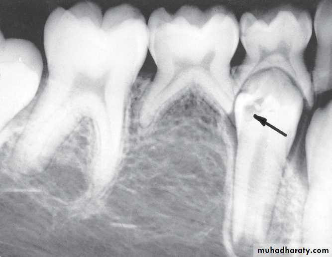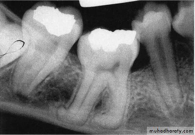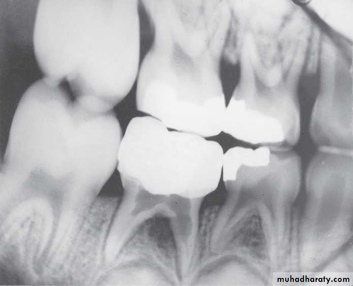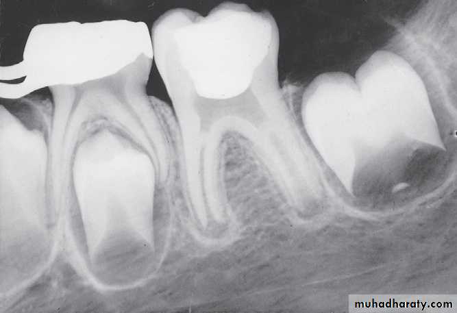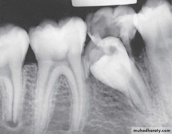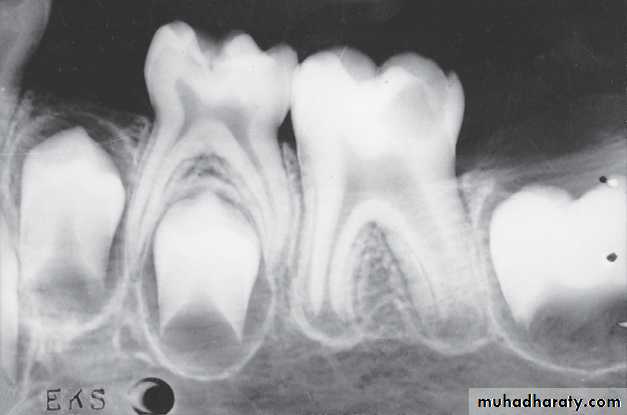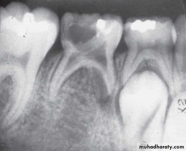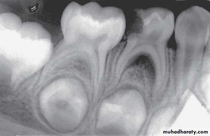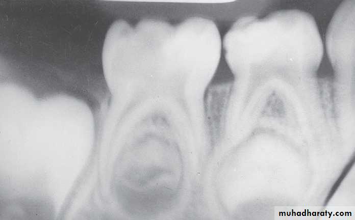 Necrotic tooth resulting from a carious exposure of the pulp of the second primary molar. Because the succedaneous second premolar was congenitally missing, a decision was made to attempt to save thetooth as a functional space maintainer through the growing years, if possible. Note the evidence of internal resorption