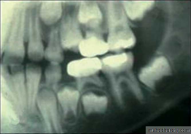 has caused hypoplasia of the second premolar and delayed eruption of the tooth.Pre-eruptive “caries” on the crown of an