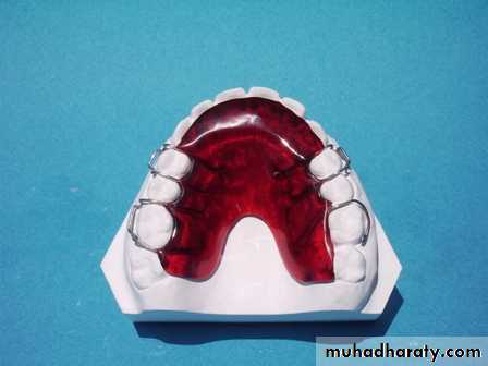 The baseplate needs to be thick enough. Ideally, this should be about as thick as a sheet of modelling wax. Should cover most of hard palate, finishing just distal to the first molars.The baseplate should fit closely around the necks of teeth that are not being moved– otherwise food packing and gingival hyperplasia may occur. Baseplates are generally manufactured from cold-cured acrylic.