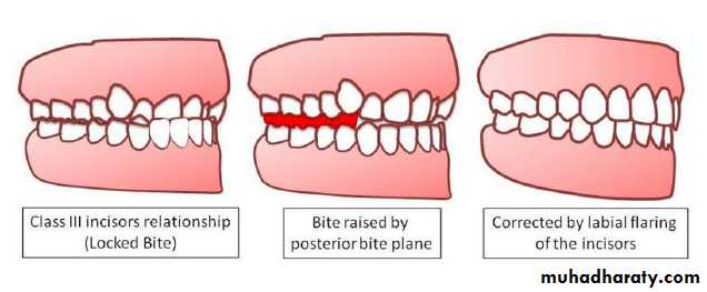 Acrylic of the base plate may be thickened anteriorly or posteriorly to form the bite plane.