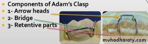 Adams clasp • Adams clasp was first descried by professor phillip Adams . it is also known as liverpool clasp ,universal clasp and modified arrowhead clasp . The clasp is constructed using 0.7mm hard round stainles steel wire . Adams clasp is made up of three parts (a) two arrowheads (b)bridge (c)two retentive arms. The two arrow heads engage the mesial and the distal proximal undercuts . The arrow heads are connected to each other by a bridge that is at 45 degree to the long axis of the rootAdvantages of adams clasp