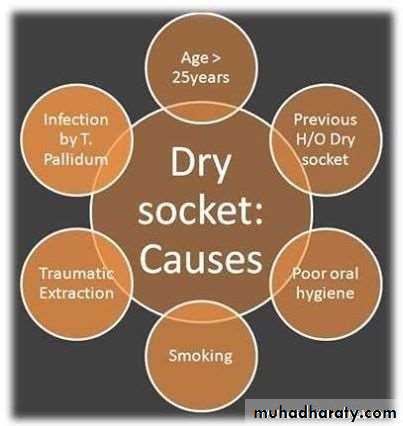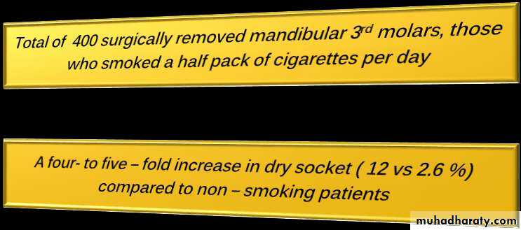 • Incidence of dry socket is > 40 % among patients who smoked on the day of surgery or on the first post operative day.