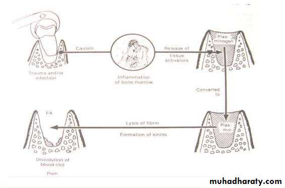 • Kinins activates the primary afferent nerves, which may have already been presensitized by other inflammatory mediators and algogenic substances ( even in concentrations as low as 1 ng/ml)• Infection