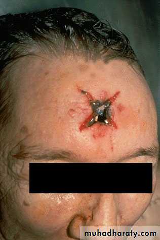 فتحة دخولية دائرية لمقذوف ناري للاسلحة محلزنة السبطانة محاطة باسوداد كاربوني واضح مع كسور انفجارية في الجمجمة بالنسبة للصورة الى اليسار ويمكن ازالة الاسوداد الكاربوني بالمسح بقطعة قماش (مسافة اطلاق قريب بين 15-40 سم)