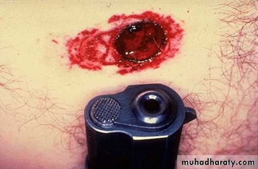 مدخل مقذوف ناري للاسلحة محلزنة السبطانة غير منتظم الشكل محاط بالوشم البارودي ( ذرات كاربون غير مشتعلة منغرزة في الجلد) ولا يمكن ازالة الوشم البارودي بالمسح (مسافة اطلاق قريب بين 40-90 سم)