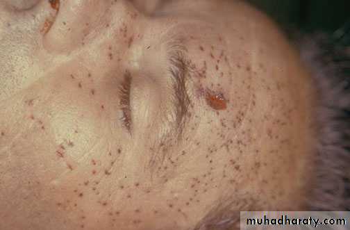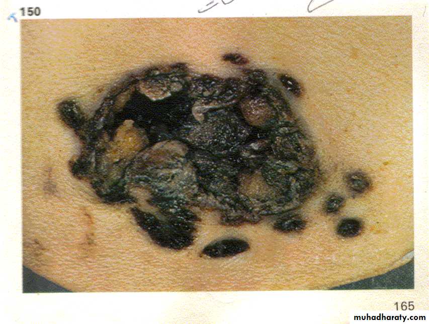 حيث يلاحظ وجود جرح مركزي كبير غير منتظم الشكل ذو حواف مشرشرة وغير محاطة بطوق سحجي من الخارج وهو محاط بعدة جروح دخولية صغيرة .ثانيا- مسافات الأطلاق البعيد .