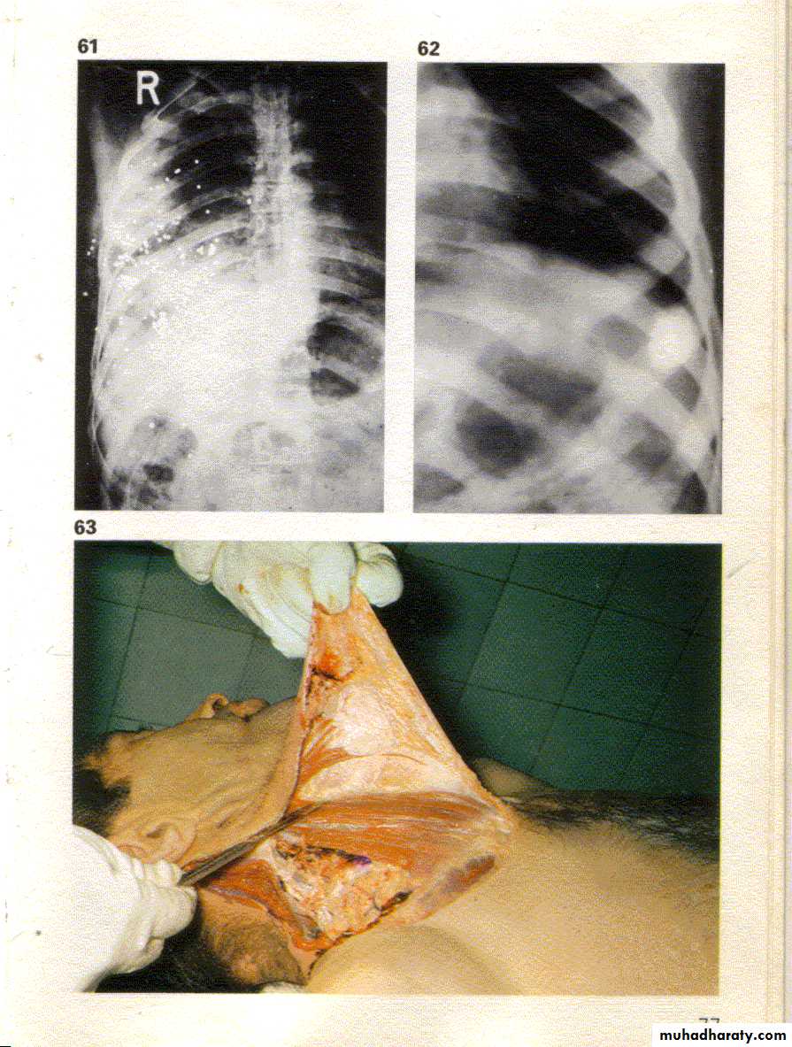 حيث يلاحظ وجود كرات معدنية متعددة صغيرة الحجم تسمى بالخرادق انتشرت في الرئة اليمنى مما يدل على أن السلاح الناري المستخدم في الحادث هو أملس السبطانة .3- مسافة الأطلاق مابين ( قدم – ياردة ) .