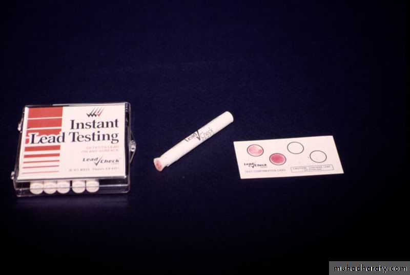 kits are commercially available for detecting lead.These swabs, when wiped on a surface, turn red in the presence of lead.