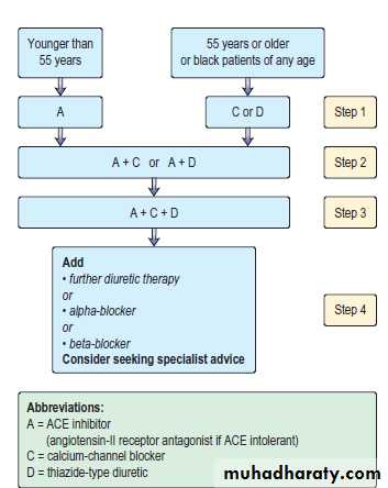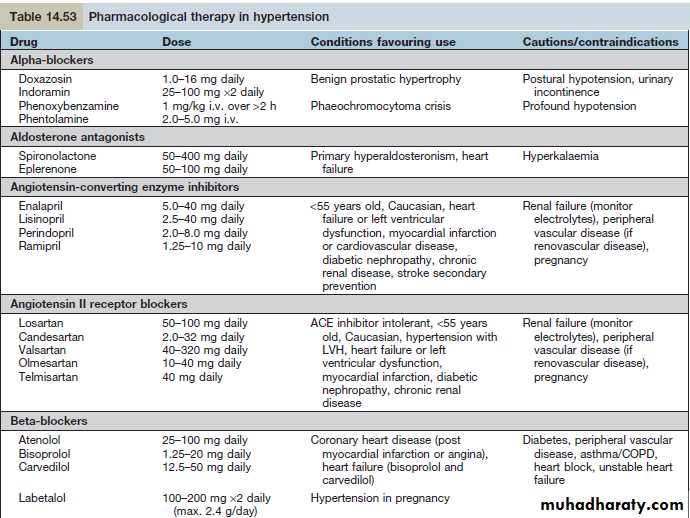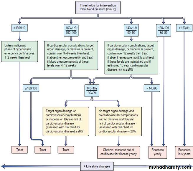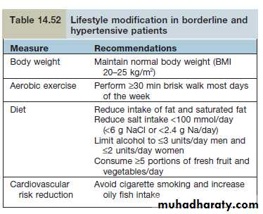 Unless the patient has severe or malignant hypertension, there should be a period of assessment with repeated blood pressure measurements, combined with advice and non-pharmacological measures prior to the initiation of drug therapy (Table 14.52(The British Hypertension Society provides guidance on when treatment should be commenced (Fig. 14.120(