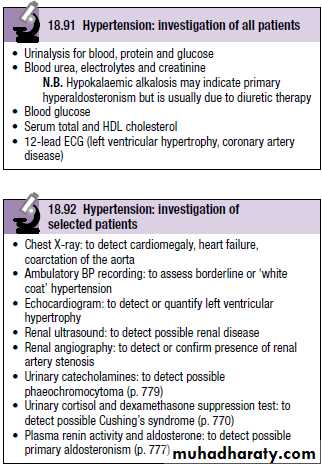 All hypertensive patients should undergo a limited number of investigations (Box 18.91). Additional investigations are appropriate in selected patients (Box 18.92).