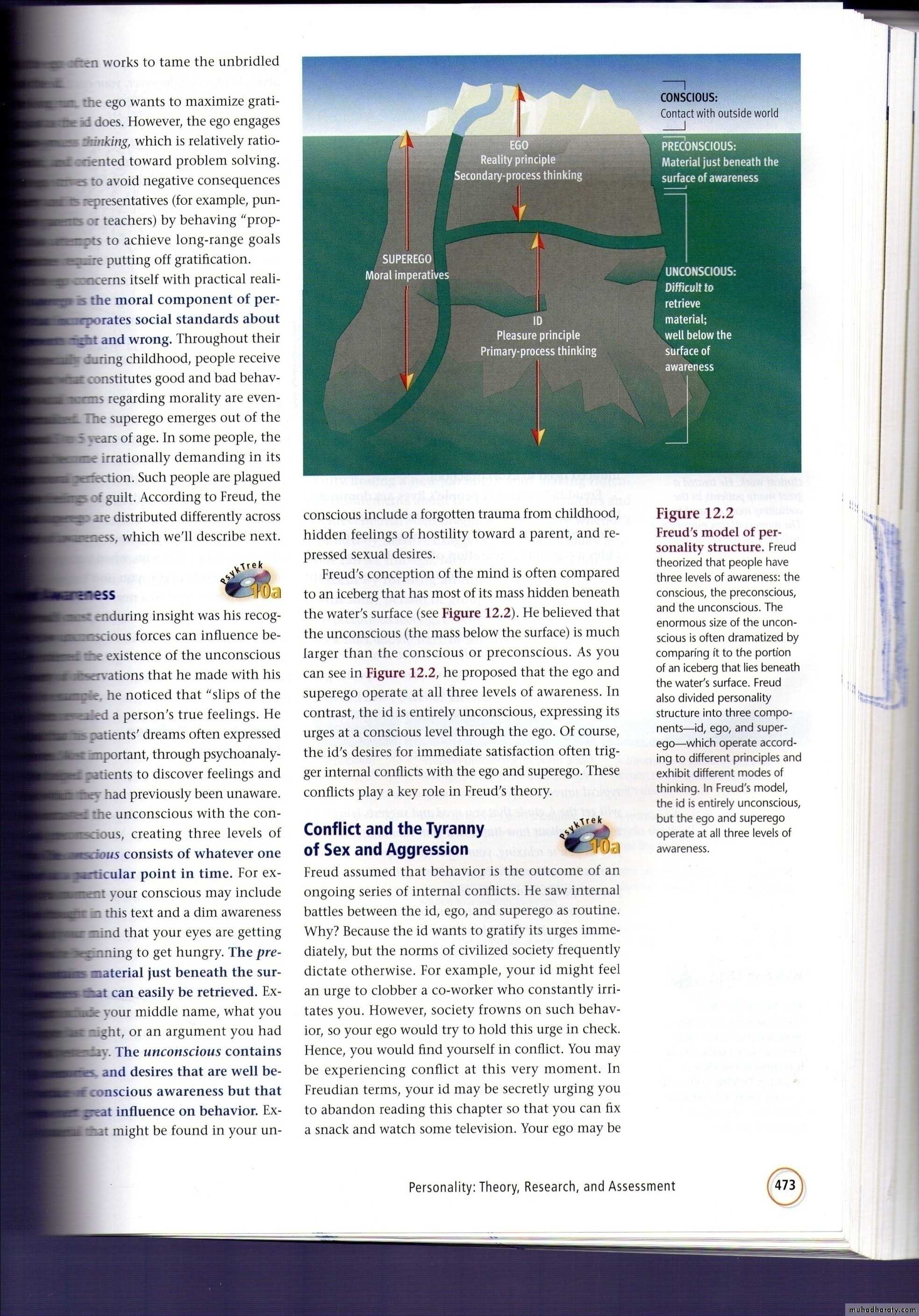Freud believed that personality has three basic components: the( Id) ,( ego) and ( superego),and the personality motivated throughout life by the fundamental drive called(Libido)which provided psychic-energy that devoted to the achievement of goals.Id: According to Freud we born with our id. The id is an important part of our personality. Because it is as a newborns, it allows us to get our need met. It is the most primitive or innate part of personality. The Id operates according to the( pleasure principle) , that is seeking pleasure and avoiding pain regardless of social beliefs. In other words, the id wants whatever feels good at the time, without consideration for the reality of situation. When the child is hungry, the id wants food .and therefore the child cries. It still speaks up until his or her needs are met with no care to reality