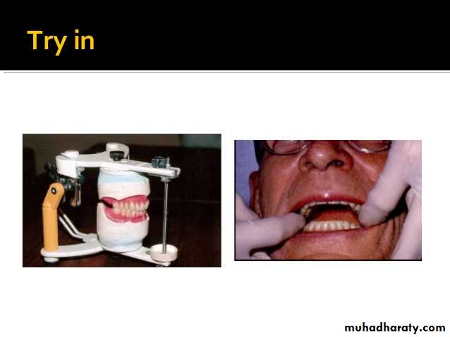 • Trying- in the upper denture.• Trying- in the lower denture.
