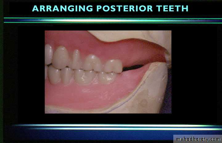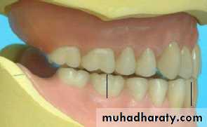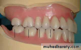 In most patients, the incisal edges of the natural lower canines and the cusp tips of the lower first premolars are located at the level of the lower lip at the corner of the mouth when the mouth is slightly open.The posterior end of the occlusal plane should be at the level of the anterior two thirds of the retro molar pad.