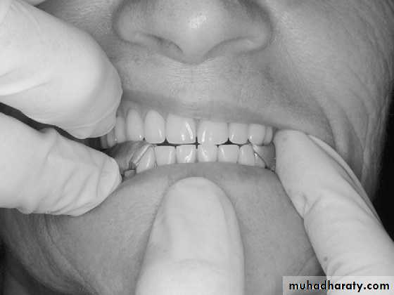 • Ask the patient to open his mouth slightly and let his tongue touch the cingula of the lower anterior teeth, support the chin of the patient with the left hand and pull the teeth straight upwards to check the retention of the anterior labial and lingual flanges.
