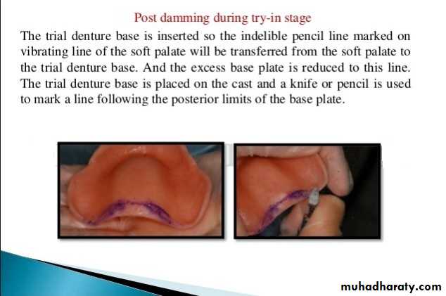 The posterior border of the upper trial denture base should extended from the one hamular notch to the other along the vibrating line of the soft palate, and correctly placed on the master cast.If the post dam is not done before, it should be done at this stage.