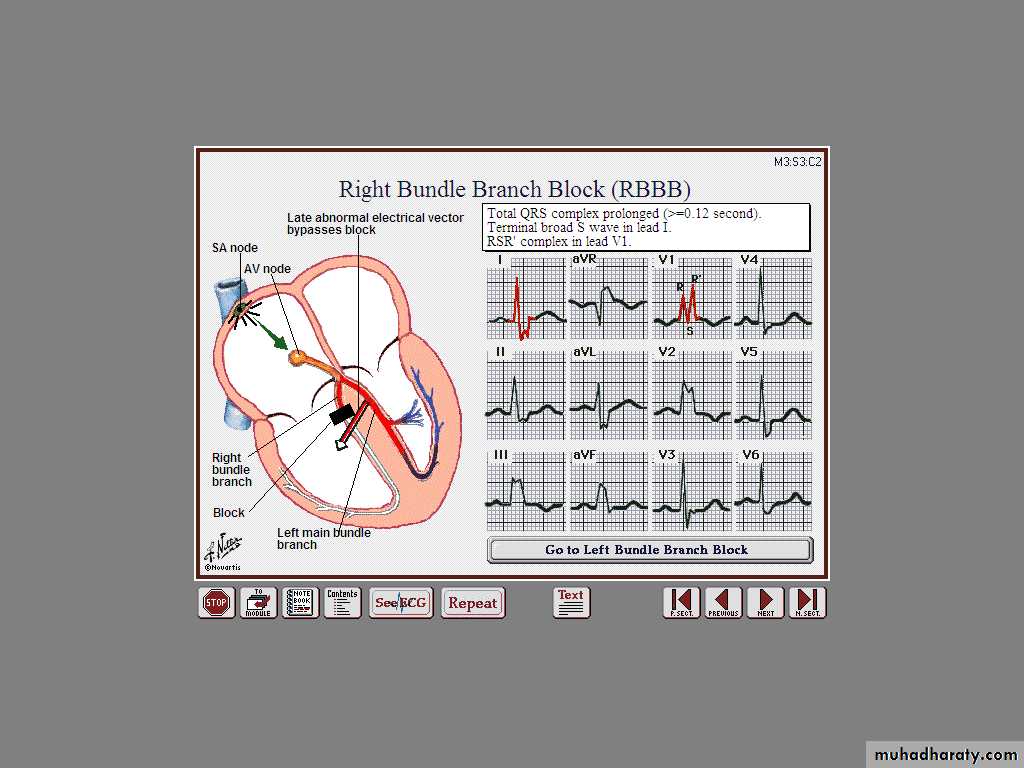 Conduction block in the right or left bundle branch can occur as a result of many pathologies, including ischaemic or hypertensive heart disease or cardiomyopathies. Depolarisation proceeds through a slow myocardial route in the affected ventricle rather than through the rapidly conducting Purkinje tissues that constitute the bundle branches. This causes delayed conduction into the LV or RV, broadens the QRS complex (≥ 0.12 s) and produces the characteristic alterations in QRS morphology. Right bundle branch block (RBBB) can occur in healthy people but left bundle branch block (LBBB) often signifies important underlying heart disease.