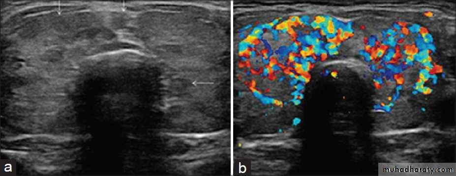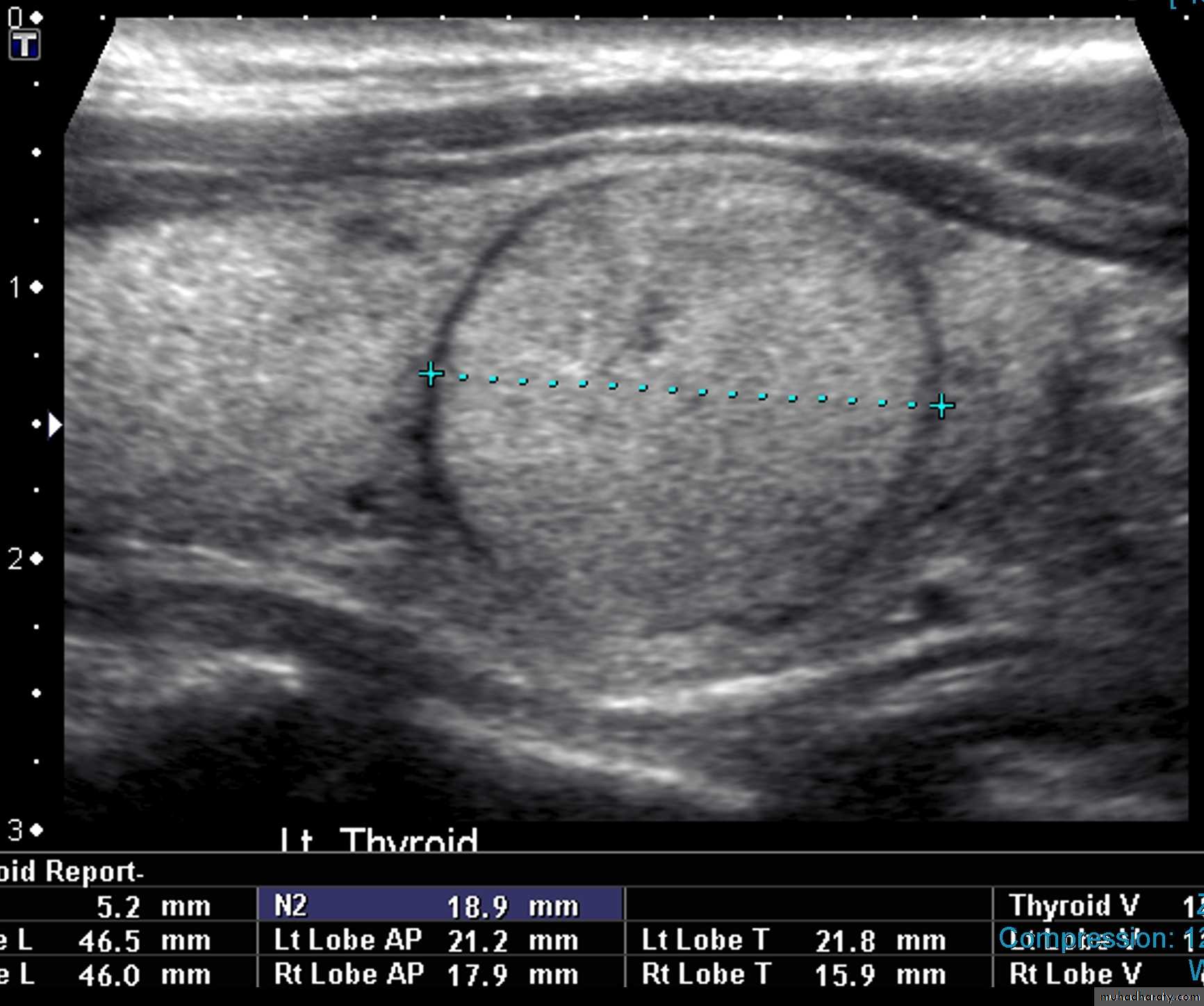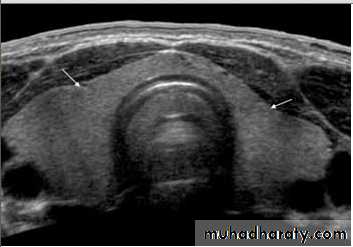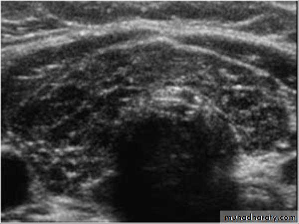 • Ultrasound: enlarged, hypoechoic and hypervascular thyroid.