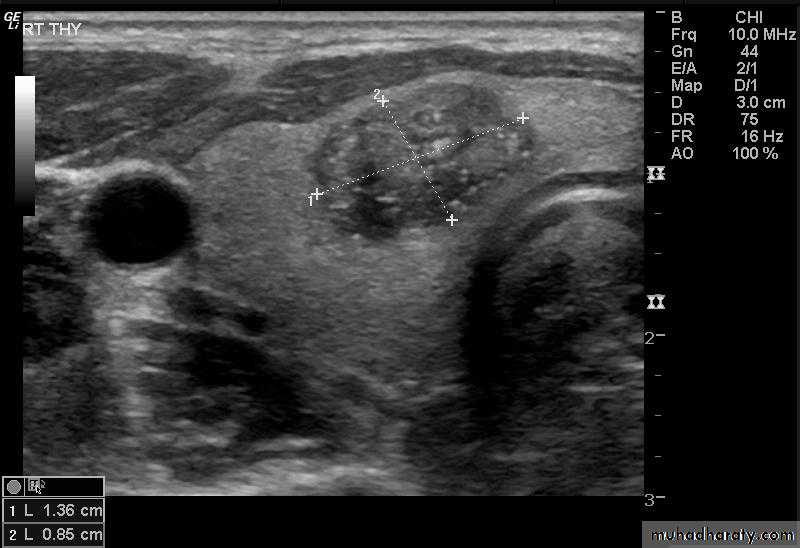 • Features of thyroid nodules assessed with US include:• Size: the incidence of cancer in nodules smaller than 1 cm is extremely low