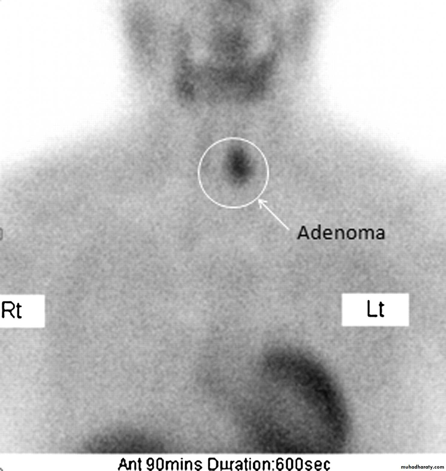• It is the investigation of choice.• 99mTc is more widely available than radioiodine and has a lower radiation dose.