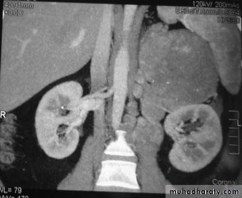 • CT of the abdomen, with particular attention to the adrenal glands is the initial imaging investigation of choice in the diagnosis of phaeochromocytoma.