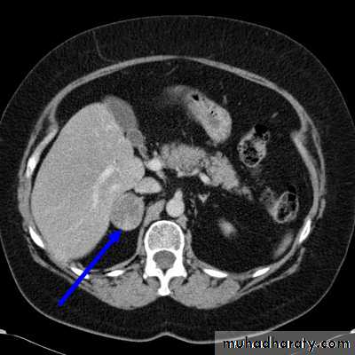 • Low density on unenhanced scans due to the high fat content of normal adrenal cells.