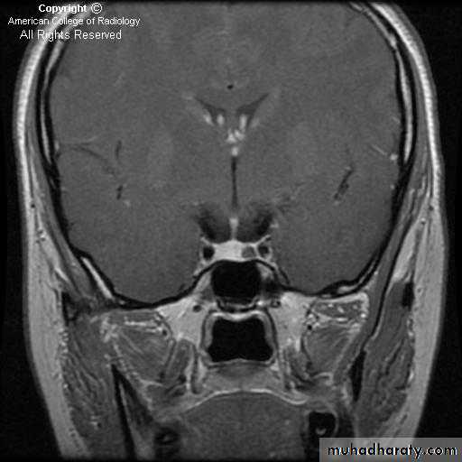 • Coronal T1-weighted scans with dynamic contrast enhancement are particularly useful for the diagnosis of microadenomas. Where MRI is unavailable or contraindicated CT may be used, however it is much less sensitive.