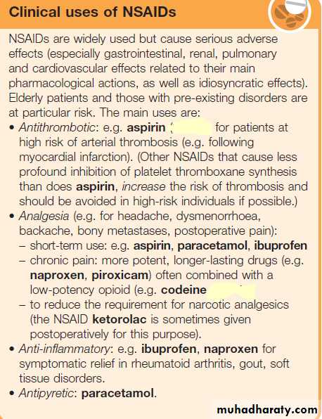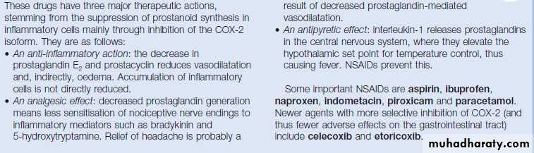 Opioid analgesics act primarily in the spinal cord and brain to inhibit the neurotransmission of pain. In contrast, nonopioid analgesics act primarily in peripheral tissues to inhibit the formation of algogenic or pain-producing substances such as prostaglandins. Because most of the nonopioid analgesics also exhibit significant antiinflammatory activity, they are called nonsteroidal antiinflammatory drugs (NSAIDs).