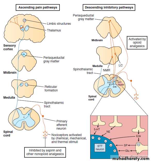 The medullary neurons include serotonergic nerves arising in the nucleus magnus raphe (NMR) and noradrenergic nerves arising in the locus ceruleus (LC). When these nerves release serotonin and norepinephrine in the spinal cord, they inhibit dorsal spinal neurons that transmit pain impulses to supraspinal sites. Nerve fibers from the PAG also activate spinal interneurons that release an endogenous opioid peptide, met-enkephalin. The enkephalins act presynaptically to decrease the release of pain transmitters from the central terminations of primary afferent neurons. They also act on postsynaptic receptors on spinothalamic tract neurons in the spinal cord to decrease the rostral transmission of the pain signal. Opioid analgesics activate the descending PAG, NMR, and LC neuronal pathways, and they also directly activate opioid receptors in the spinal cord.