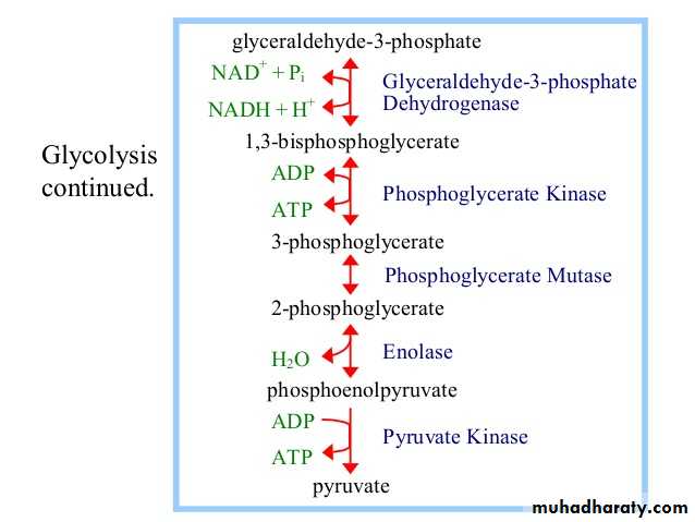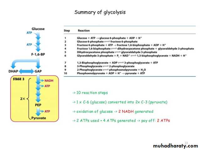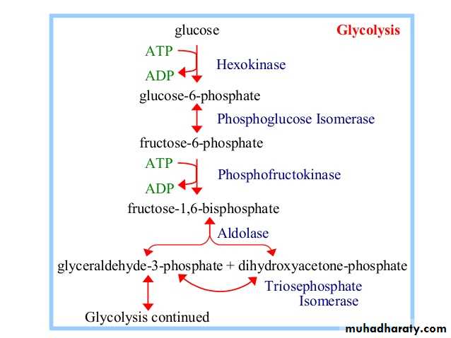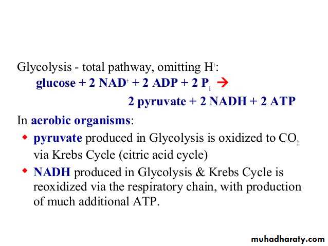 Glycolysis is the process of breaking down a glucose molecule into two pyruvate molecules, while storing energy released during this process as ATP and NADH. Nearly all organisms that break down glucose utilize glycolysis. Glucose regulation and product use are the primary categories in which these pathways differ between organisms. In some tissues and organisms, glycolysis is the sole method of energy production. This pathway is anaerobic, because it doesn’t require oxygen. Glycolysis consists of ten steps, split into two phases. During the first phase, it requires the breakdown of two ATP molecules. During the second phase, chemical energy from the intermediates is transferred into ATP and NADH. The breakdown of one molecule of glucose results in two molecules of pyruvate, which can be further oxidized to access more energy in later processes.