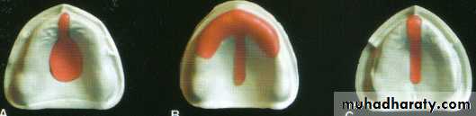 Maxilla: relief areas (incisive papilla and mid palatine raphe) and over flabby tissues if present.Mandible: crest of the ridge
