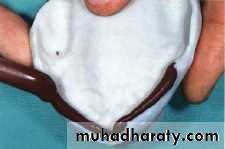The dental stone is mixed in proper consistency and poured at one end of the impression and gently tapped so that the material flows evenly throughout the impression (avoid incorporation of voids).