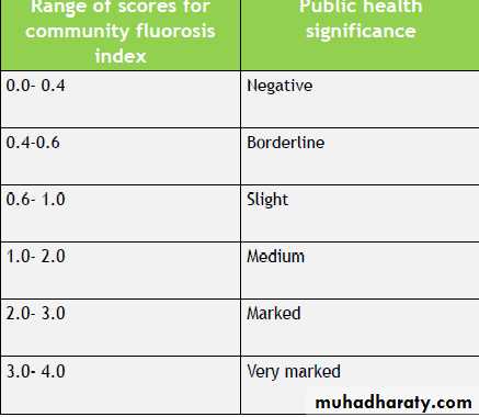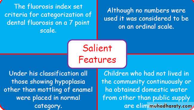 • Most widely used index to measure dental fluorosis.• Helped to indicate prevalence of moderate to severe fluorosis in many communities as