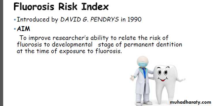 • National Fluorosis Survey in USA in 1986-87 to note baseline values was done using Dean’s index.