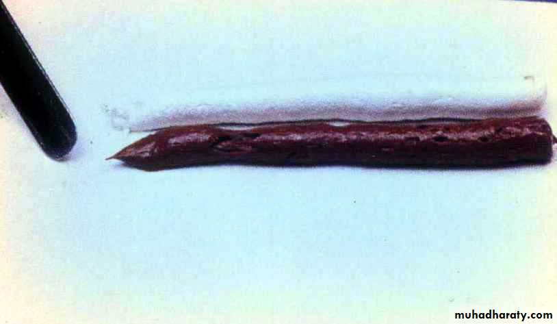 The zinc oxide paste, typically, being white and the eugenol paste, a reddish brown colour.