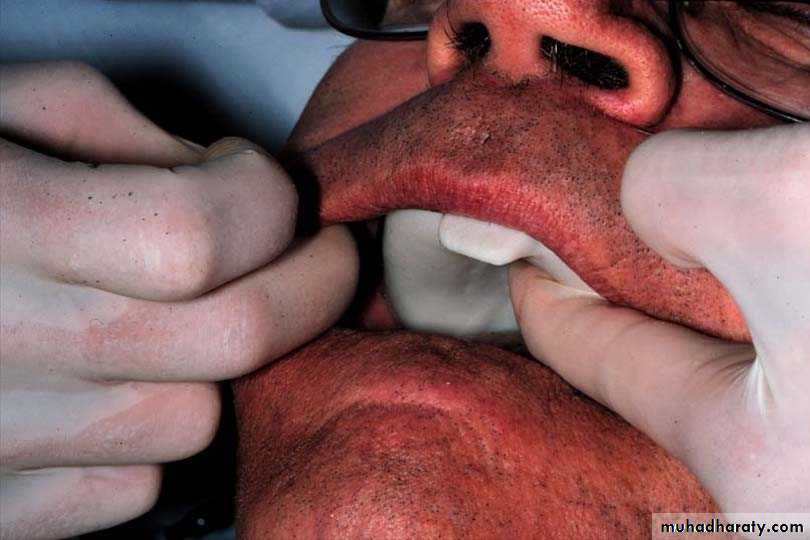 The patient applies pressure by closing against occlusion rims or teeth and executes muscle actions such as swallowing, grinning or pursing the lips while the impression material flow.