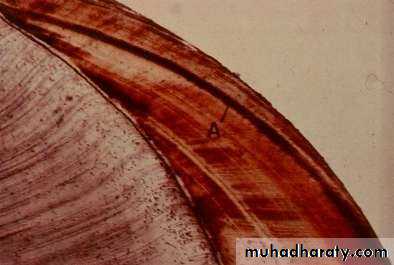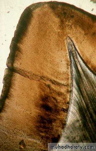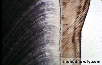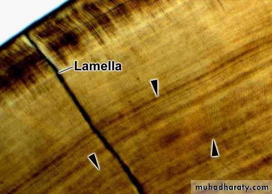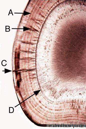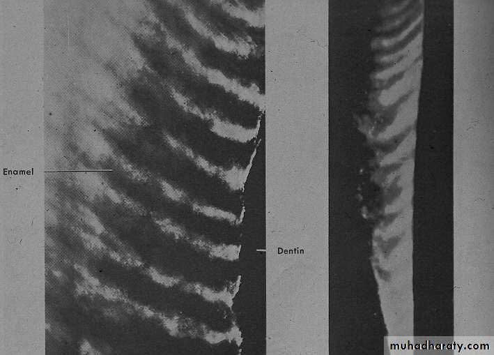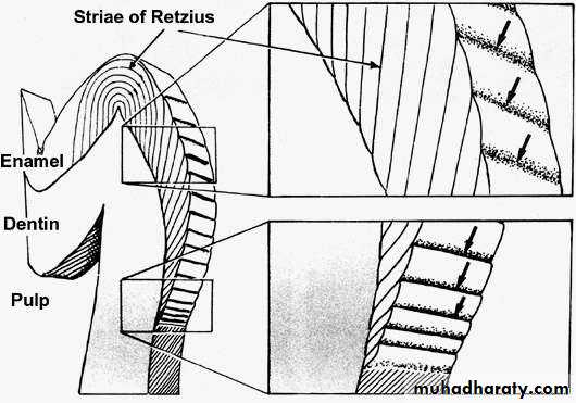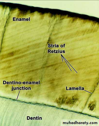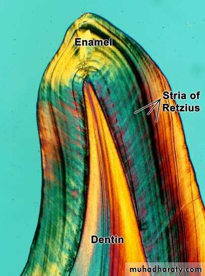 • In a longitudinal section dark lines are seen that shows the daily deposition of enamel (rhythmic manner of E. matrix formation).