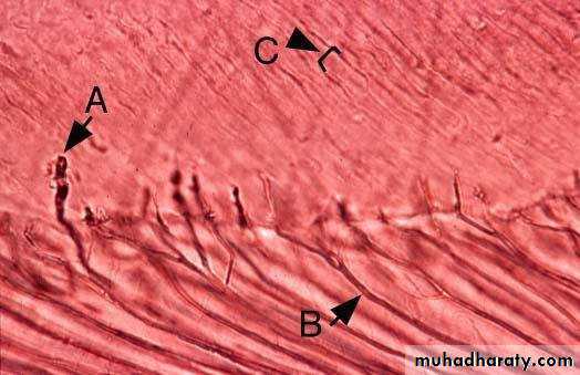 • Legend: A, Enamel spindle; B, Odontoblastprocess; C,