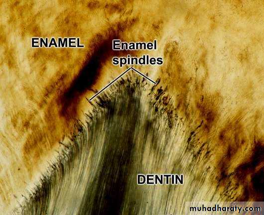 • Odontoblast processes usually end at the DEJ. However, sometimes the ends of the process become embedded in the enamel as it forms.• These very small, usually straight structures that you can see adjacent to the DEJ are enamel spindles.