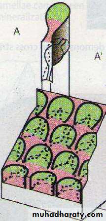• Cross section• Head of enamel rod is formed by one ameloblast and tail is formed by three ameloblasts