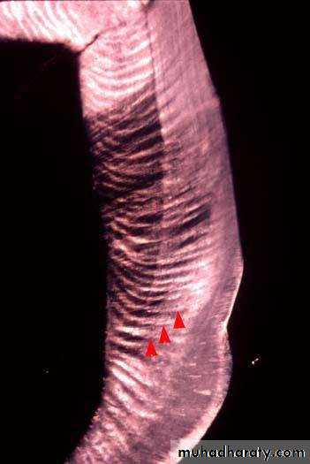 • E. rod is built-up of segments (dark lines).• Best seen in insufficient calcified E.