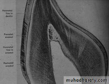 • The E. of the deciduous teeth and the 1st permanent molar (It is incremental line that is the boundary between the enamel forms before and after the birth)• The neonatal line is usually the darkest and thickest striaof Retzius.