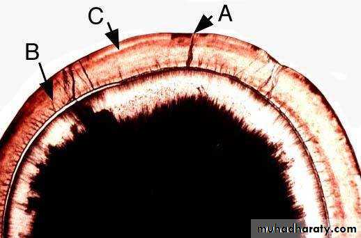 • Legend: A, Enamel lamella; B, Enamel tuft; C, Neonatal line