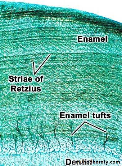 • In a transverse section of tooth, the stria of Retzius appear as concentric bands parallel to the dentino-enamel junction (DEJ). In addition to the "hypo-mineralized" dark striaof Retzius, there also exist hypo-mineralized areas perpendicular to the DEJ. These are enamel lamellae(that traverse the entire thickness of enamel) and enamel tufts(that traverse the inner third of enamel adjacent to the DEJ• sectionLegend: A, Striaof Retzius; B, Enamel tuft; C, Enamel lamella; D, DEJ