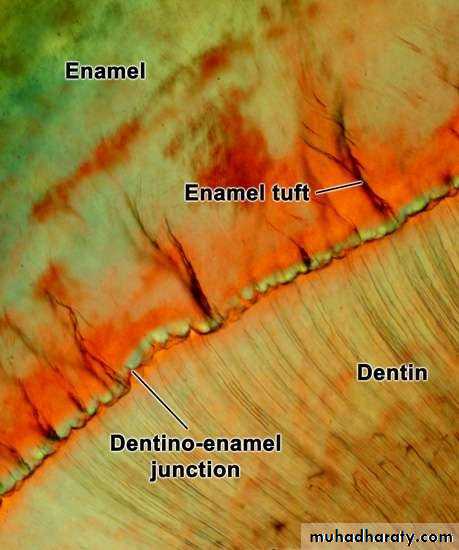 • Enamel tufts are less mineralized areas of enamel in the inner third of enamel adjacent to the DEJ. They resemble tufts of grass.