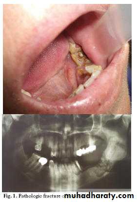 • Osteonecrosis of the bone associated with Bisphosphonates treatment, it usually appears after surgery especially tooth extraction as a painful, non-healing socket. Treatment is directed to limiting the progression of necrosis through debridement, irrigation with antiseptics and antibiotics.